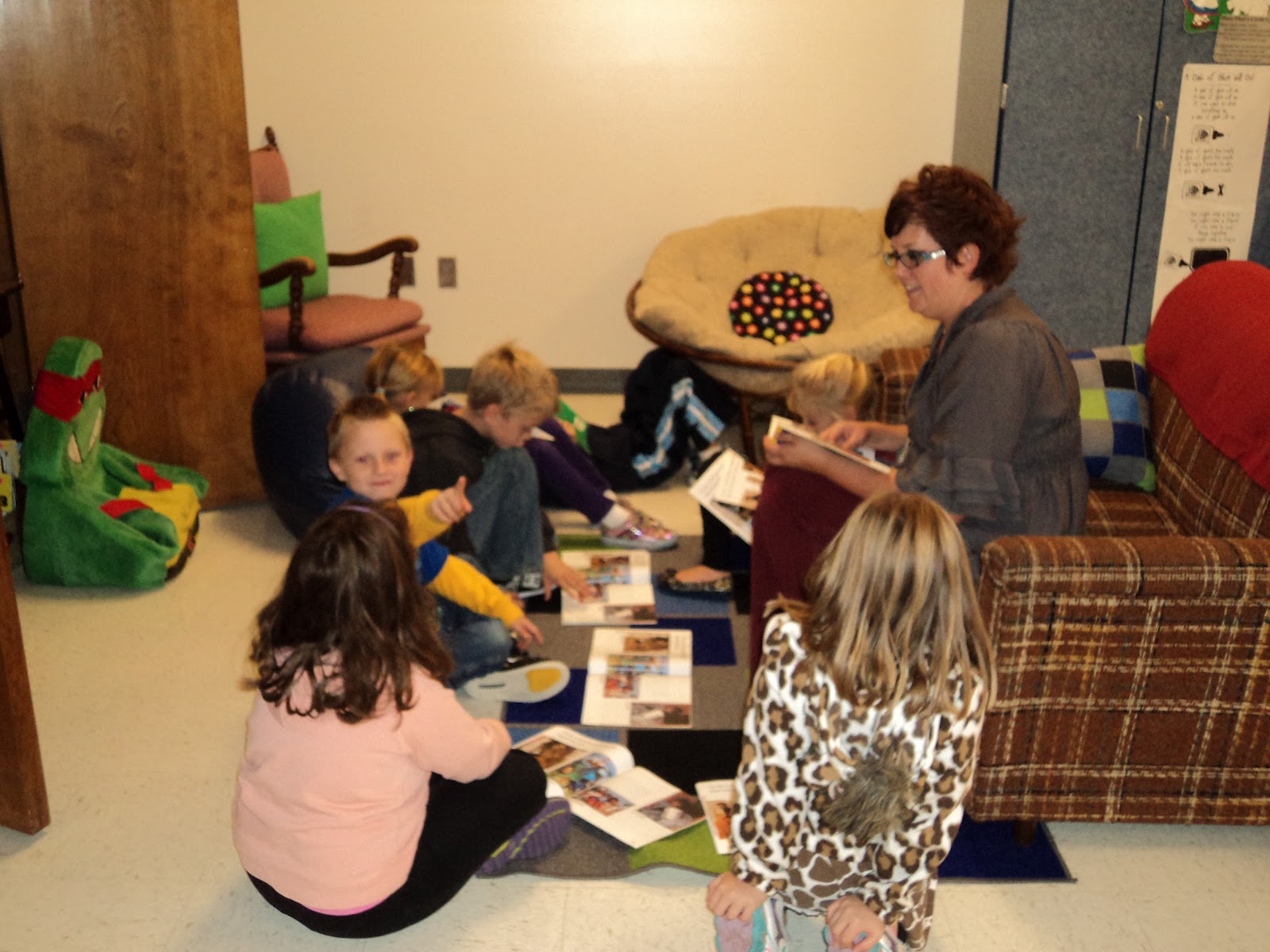 Mrs. Eastman's group is reading a story together in the reading corner!